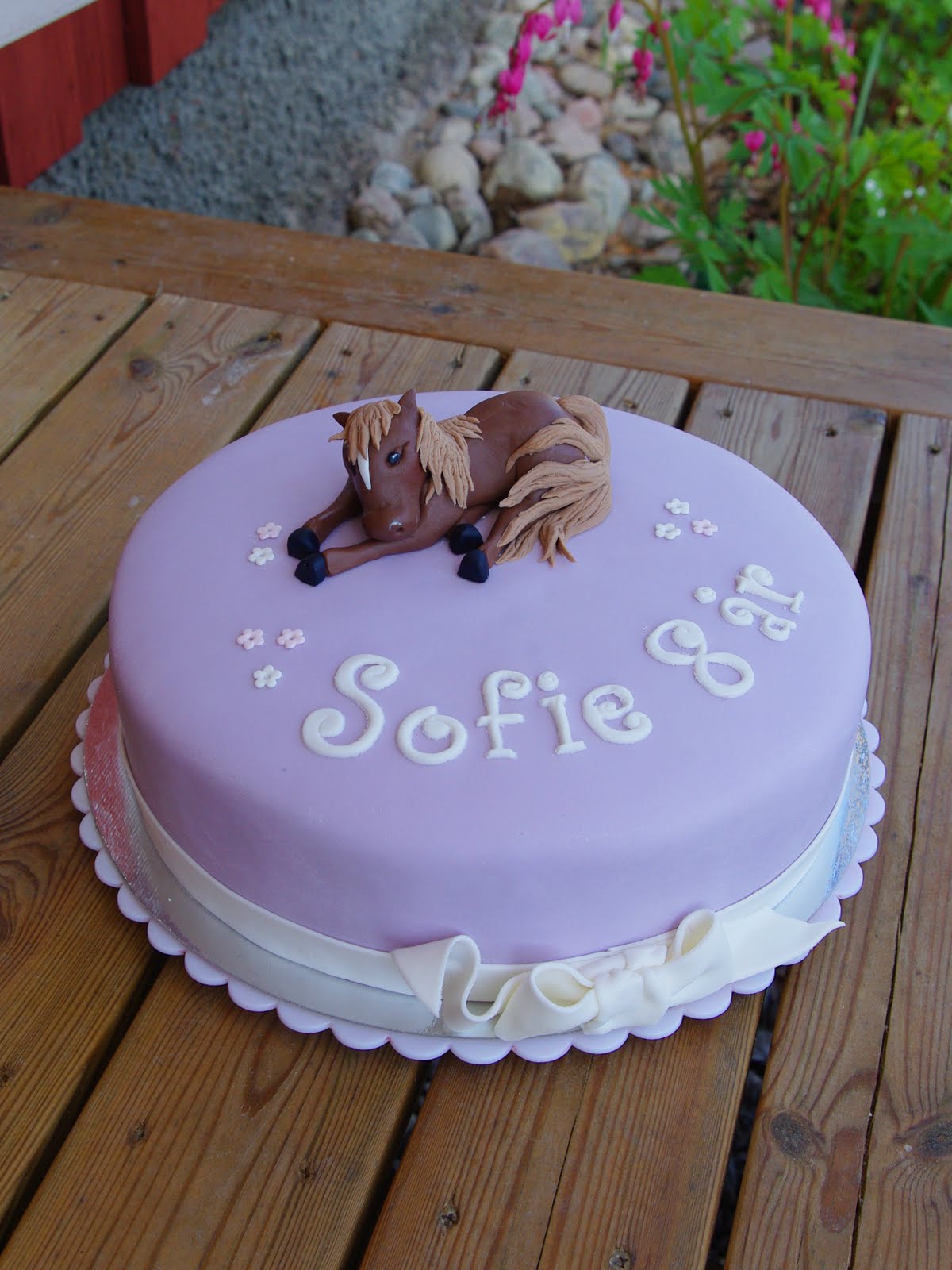 Ljusa bottnar fyllda med vaniljgrädde och chokladmousse på marabous mörka rasberry. Spacklad med grädde och täckt i sockerpasta. Dekor i sp, mp och fp.